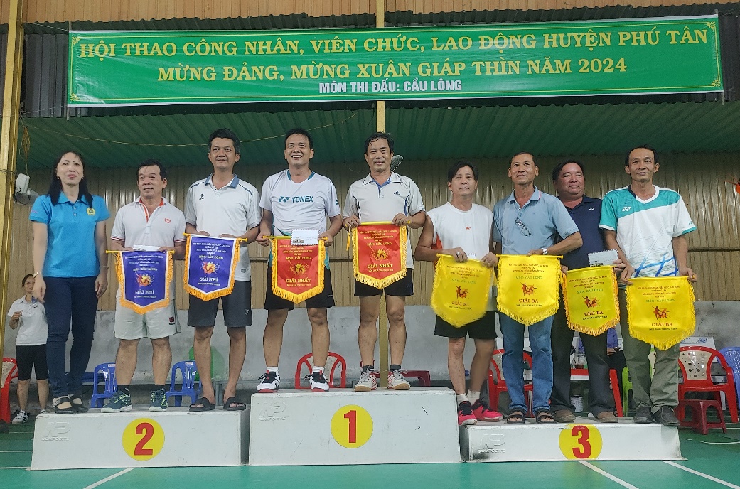 Ban Tổ chức Hội thao trao giải nhất, nhì, ba cho các đội đạt thành tích cao môn cầu lông đôi trung niên