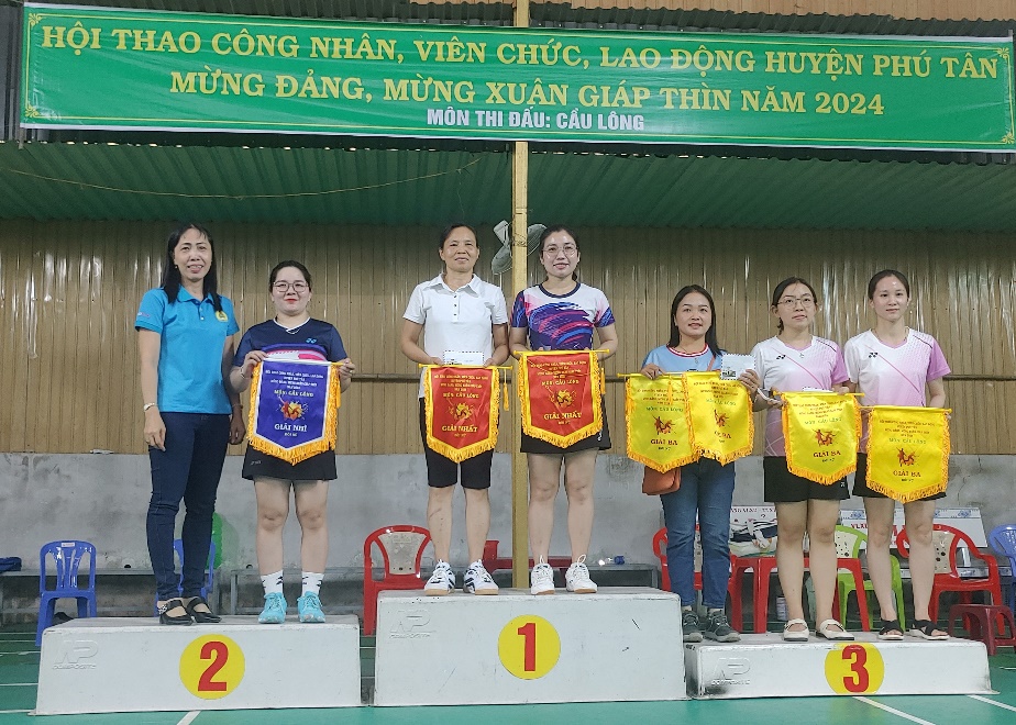 Ban Tổ chức Hội thao trao giải nhất, nhì, ba cho các đội đạt thành tích cao môn cầu lông đôi nữ