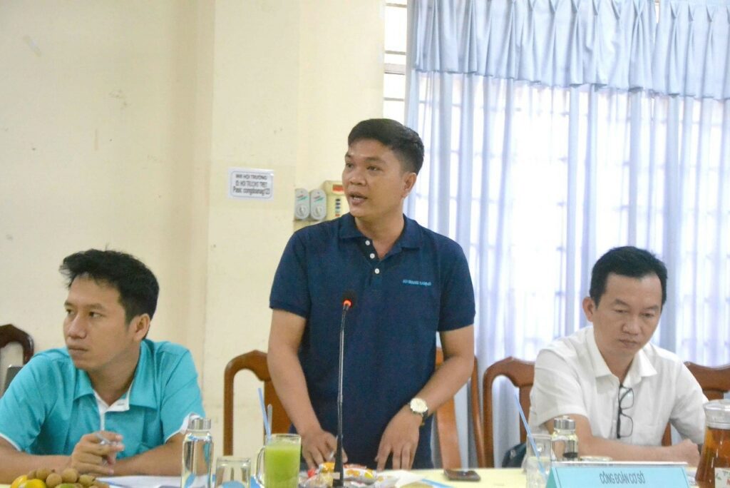 Chủ tịch CĐCS công ty TNHH An Giang Samhoo Võ Thanh Nhã đặt câu hỏi thắc mắc xoay quanh chính sách hỗ trợ. Ảnh :Lục Tùng |