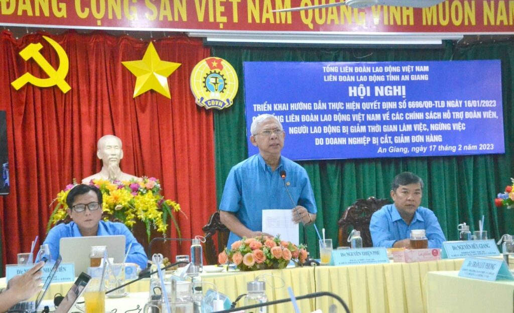 Sáng ngày 17/2, Ban Thường vụ Liên đoàn Lao động tỉnh An Giang đã tổ chức Hội nghị triển khai Hướng dẫn thực hiện Quyết định 6696/QĐ-TLĐ ngày 16/1/2023 của Tổng Liên đoàn Lao động Việt Nam về các chính sách hỗ trợ đoàn viên, người lao động bị giảm thời gian làm việc, chấm dứt hợp đồng lao động do doanh nghiệp bị cắt, giảm đơn hàng. Hội nghị triển khai theo hình thức trực tiếp 1 điểm cầu tại tỉnh và 10 điểm cầu trực tuyến tại cấp huyện với hơn 60 đại biểu tham dự, đồng chí Nguyễn Thiện Phú, TUV, chủ tịch LĐLĐ tỉnh chủ trì.