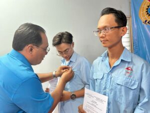 Trưởng Ban Chính sách pháp luật và Quan hệ lao động – Tô Minh Lắm cài Huy hiệu công đoàn cho đoàn viên vừa mới kết nạp