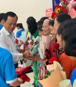 Đồng chí Đặng Văn Hập – UVTV, Trưởng Ban Dân Vận, Chủ tịch UBMTTQVN huyện trao quà cho nguyên Chủ tịch LĐLĐ huyện qua các thời kỳ