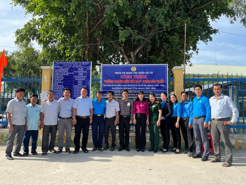 Lãnh đạo UBND huyện, UBND và BCH CĐCS thị trấn Cô Tô chụp ảnh lưu niệm trước công trình |