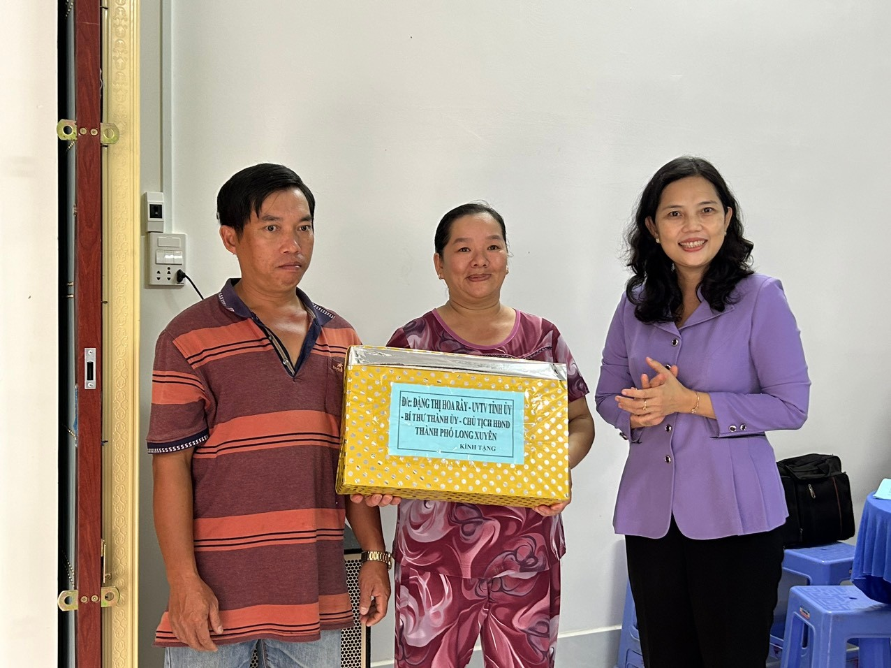 Bí thư Thành uỷ Long Xuyên Đặng Thị Hoa Rây chúc mừng và trao quà cho gia đình chị Dung