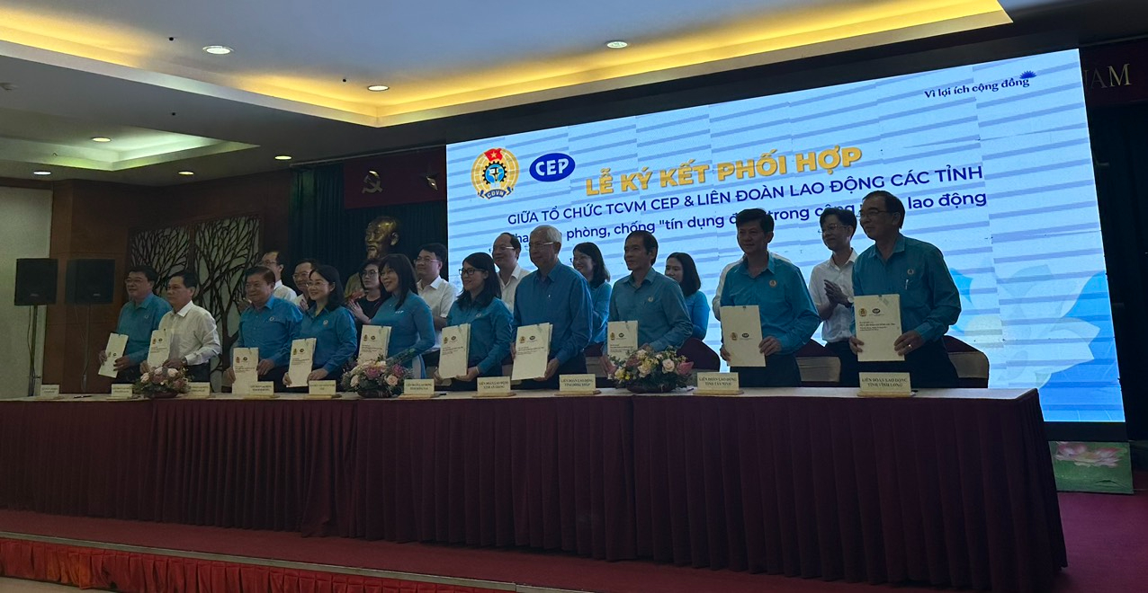 Lãnh đạo Liên đoàn Lao động Thành phố Hồ Chí Minh và Liên đoàn Lao động 09 tỉnh nơi CEP đang hoạt động (Bình Dương, Đồng Nai, Tây Ninh, Long An, Bến Tre, Tiền Giang, Vĩnh Long, Đồng Tháp và An Giang); đại diện Công đoàn cơ sở và khách hàng công nhân vay vốn CEP bị ảnh hưởng bởi “tín dụng đen” tham gia ký kết, trước sự chứng kiến của lãnh đạo Tổng Liên đoàn Lao động Việt Nam, Thành ủy Thành phố Hồ Chí Minh và Ngân hàng Nhà Nước Việt Nam – Chi nhánh Thành phố Hồ Chí Minh.
