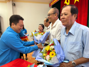 Chủ tịch LĐLĐ tỉnh Lâm Thành Sĩ tặng hoa chúc mừng và ghi nhận các công lao đóng góp của các cô, chú nguyên lãnh đạo LĐLĐ tỉnh qua các thời kỳ
