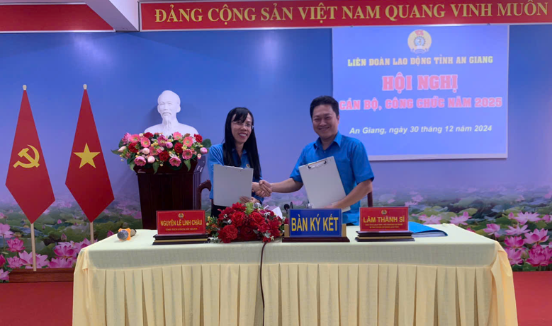 Đồng chí Lâm Thành Sĩ, Tỉnh ủy viên, Chủ tịch LĐLĐ tỉnh, đồng chí Nguyễn Lê Linh Châu, Chủ tịch Công đoàn cơ sở cơ quan LĐLĐ tỉnh ký kết giao ước thi đua năm 2025