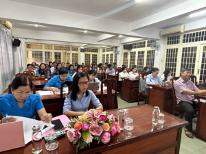 Đồng chí Nguyễn Hữu Giang, Phó Chủ tịch LĐLĐ tỉnh dự phát biểu khai mạc, cùng các đồng chí Chủ tịch, Phó chủ tịch, kế toán công đoàn cơ sở tại các doanh nghiệp trực thuộc.