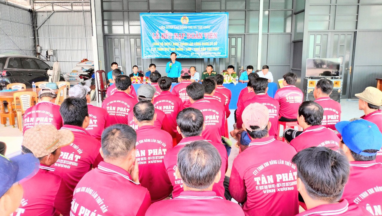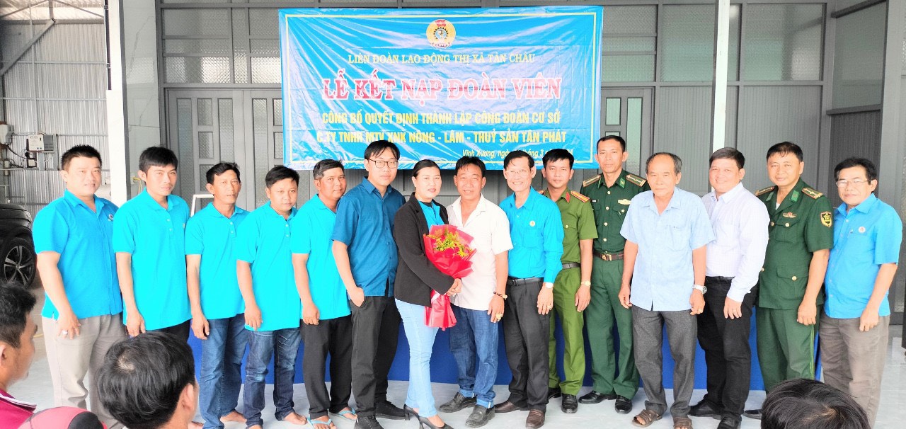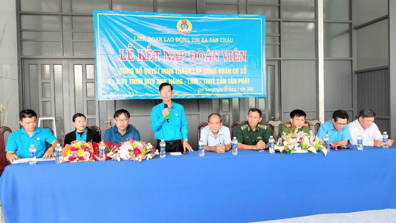 Sáng ngày 30/3/2024, Ban Thường vụ Liên đoàn Lao động thị xã Tân Châu tổ chức lễ công bố quyết định thành lập công đoàn cơ sở (CĐCS) Công ty TNHH MTV XNK Nông – Lâm – Thuỷ sản Tân Phát. Đến dự có ông Phan Ngọc Quế, Chủ tịch Liên đoàn Lao động Thị xã: ông Võ Hoàng Tân, Giám Đốc Công ty TNHH MTV XNK Nông – Lâm – Thuỷ sản Tân Phát.