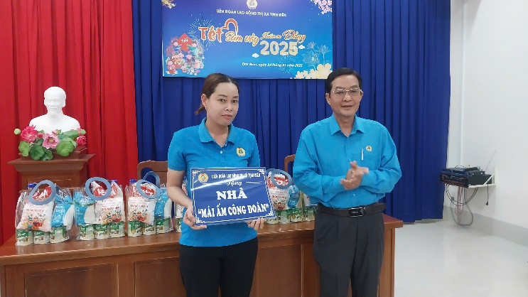 Tại chương trình đã trao 120 phần quà Tết cho đoàn viên và người lao động có hoàn cảnh khó khăn, bệnh hiểm nghèo, tai nạn lao động, bệnh nghề nghiệp, mỗi phần quà trị giá 01 triệu đồng, bao gồm: Nhu yếu phẩm và 700 ngàn đồng tiền mặt. Đồng thời, trao bảng tượng trưng “Mái ấm công đoàn” cho đồng chí Nguyễn Thị Ngọc Trân là đoàn viên đang sinh hoạt tại công đoàn cơ sở trường Tiểu học B phường Tịnh Biên. Căn nhà được hỗ trợ trị giá 50 triệu đồng.