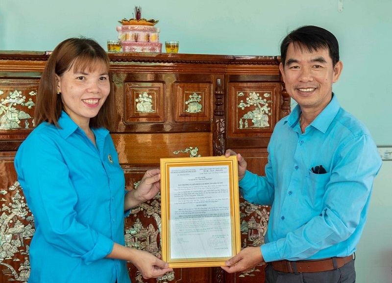 Chủ tịch LĐLĐ thành phố Long Xuyên Trương Văn Chiêm trao quyết định tặng “Mái ấm công đoàn” cho đoàn viên Võ Thị Thiên Hương |