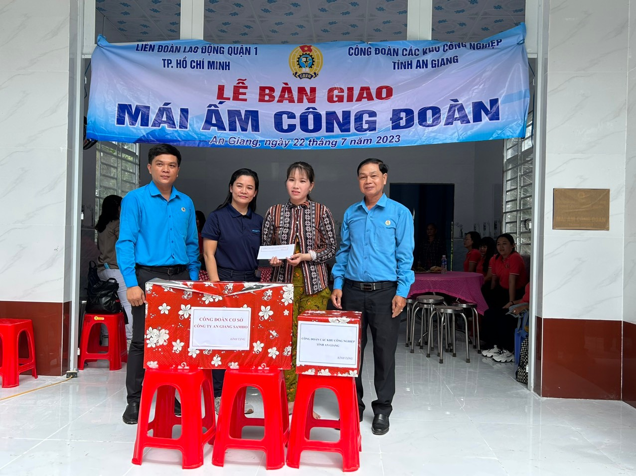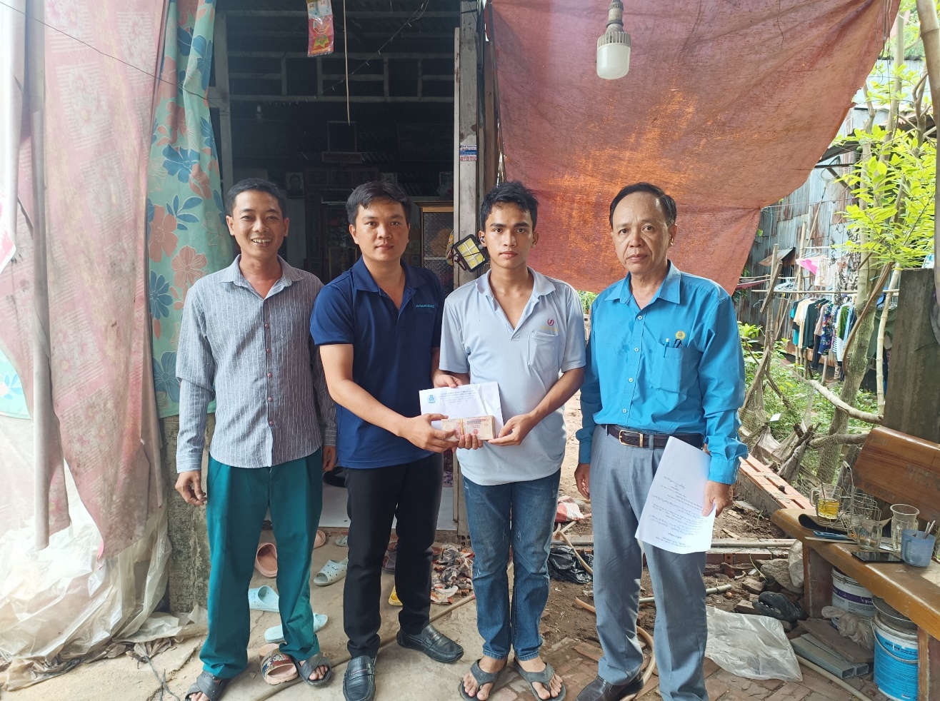 Chủ tịch công đoàn cơ sở Lê Thanh Nhã trao tiền hỗ trợ nhà Mái ấm công đoàn cho đoàn viên có hoàn cảnh khó khăn từ nguồn hỗ trợ của Mạnh thường quân