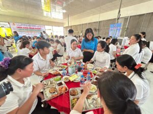 Phó Chủ tịch LĐLĐ tỉnh – Lư Thị Kim Thùy đến từng bàn ăn để thăm hỏi, động viên người lao động
