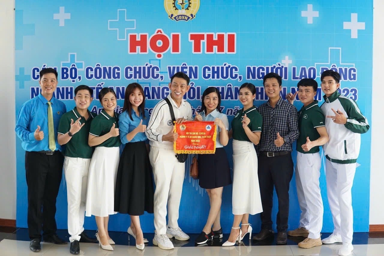 Chị Thoa (giữa) cùng đồng đội tham gia Hội thi cán bộ, công chức, viên chức, người lao động giỏi, thân thiện do Công đoàn ngành Y tế tổ chức năm 2023
