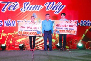 Phó Chủ tịch Thường trực LĐLĐ tỉnh Nguyễn Hữu Giang trao Giải đặc biệt cho đoàn viên, người lao động Công ty TNHH An Giang Samho tại Chương trình “Tết Sum vầy” do CĐCS Công ty tổ chức