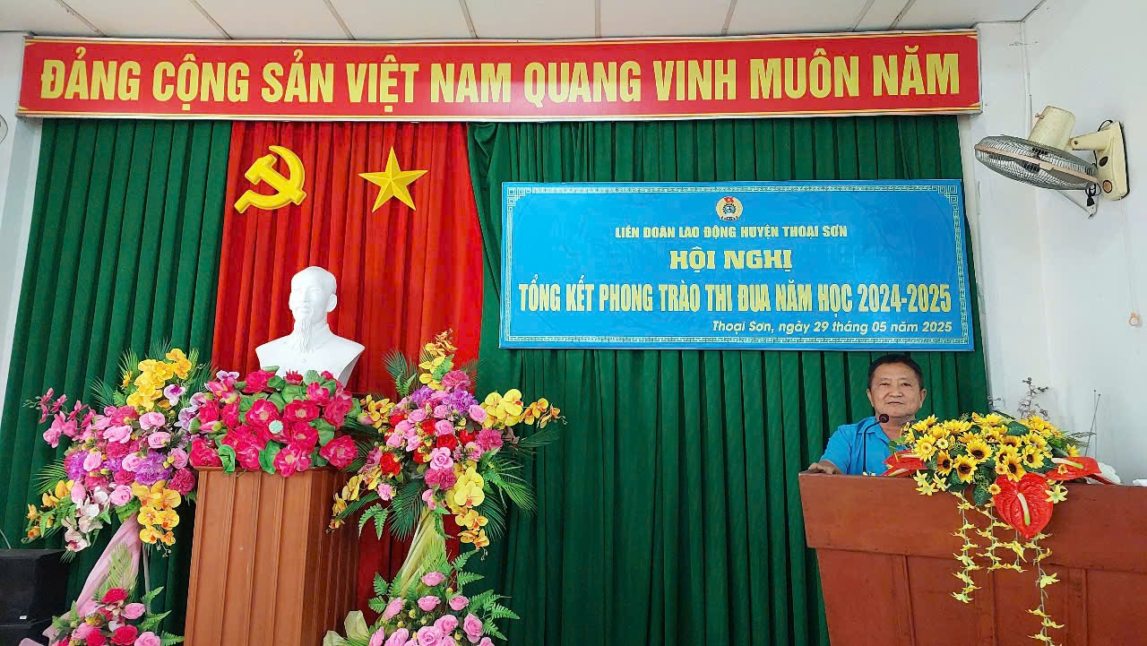 Phát biểu chỉ đạo tại hội nghị, Chủ tịch LĐLĐ huyện Thoại Sơn ghi nhận và biểu dương những thành tích nổi bật của các CĐCS. Đồng chí nhấn mạnh vai trò nòng cốt của đội ngũ công đoàn viên trong việc nâng cao chất lượng dạy và học, xây dựng môi trường giáo dục lành mạnh, thân thiện và hiệu quả. Đồng thời, đề nghị các CĐCS tiếp tục phát huy tinh thần đoàn kết, đổi mới nội dung và hình thức thi đua, góp phần thực hiện thắng lợi nhiệm vụ năm học 2025 – 2026.