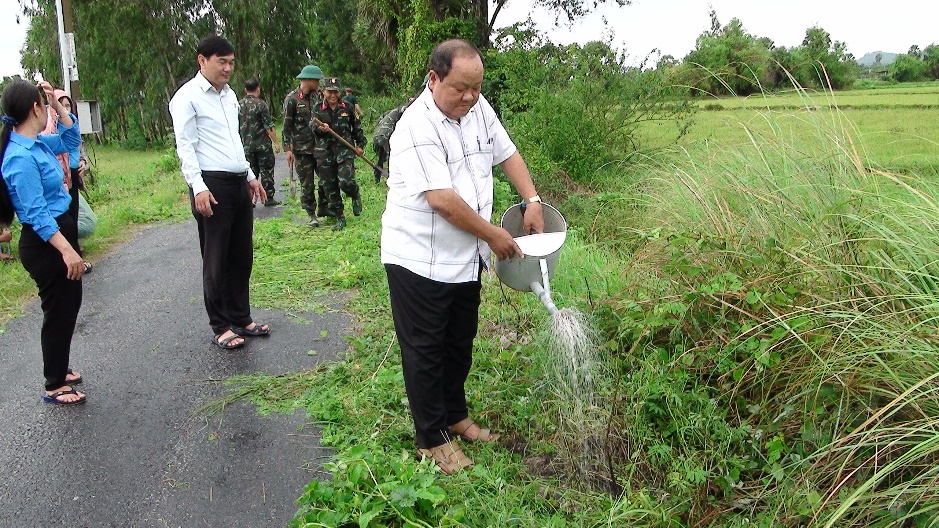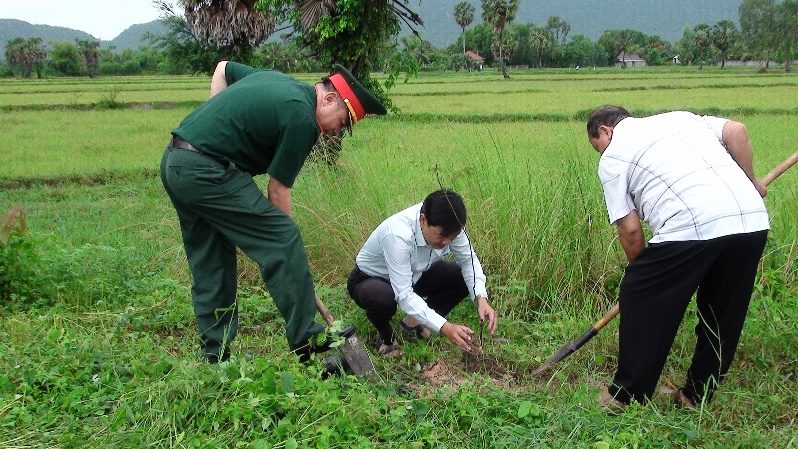 Lãnh đạo Phòng Kinh tế; Lữ đoàn Tăng thiết giáp và Đảng ủy xã Vĩnh Trung trồng và tưới nước cho cây vừa trồng