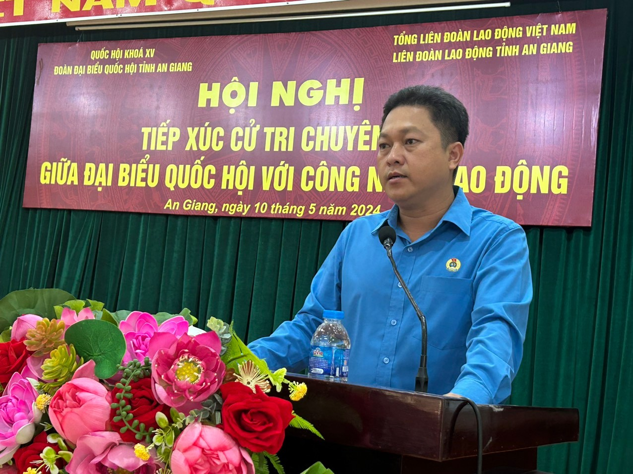 Sáng 10-5, tại Hội trường cơ quan Liên đoàn Lao động tỉnh, Liên đoàn Lao động tỉnh An Giang phối hợp Đoàn đại biểu Quốc hội tỉnh tổ chức Hội nghị tiếp xúc cử tri chuyên đề Đoàn đại biểu Quốc hội với công nhân lao động trước kỳ họp thứ Bảy, Quốc hội khóa XV.